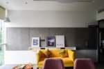 a long hallway with yellow and black accents